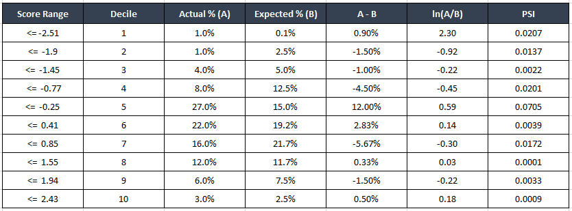 Population Stability Index Formula: Sum of (Actual% – Expected%) * Ln(Actual%/Expected%)