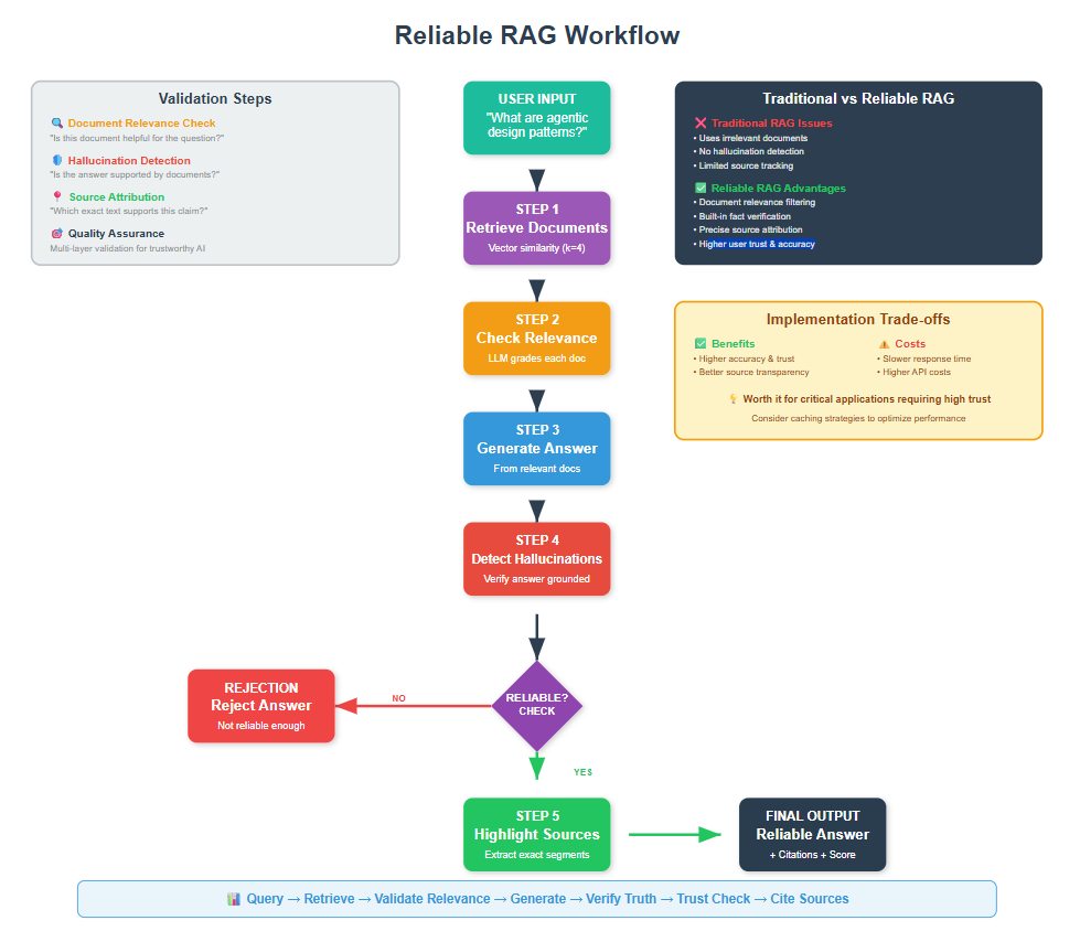 Reliable RAG is an enhanced Retrieval-Augmented Generation approach that adds multiple validation layers to ensure your AI system gives accurate, relevant, and trustworthy answers. Instead of just retrieving documents and generating responses, Reliable RAG checks document relevance, detects hallucinations, and highlights exactly which sources support each answer.