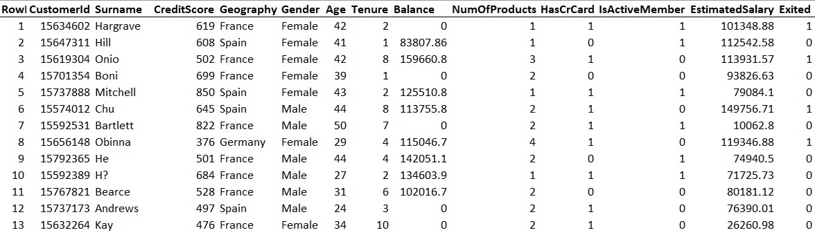 To do this we will use a dataset that contains information about each customer (both churned and active). The dataset in the below image contains data about a company’s customers and if the given customer has churned or not. See the ‘Exited’ column in the below image.