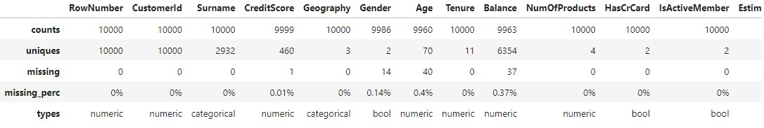 By looking at ‘uniques’ row, it is considering ‘Gender’, ‘HasCrCard’, ‘IsActiveMember’, ‘Exited’ columns as boolean.