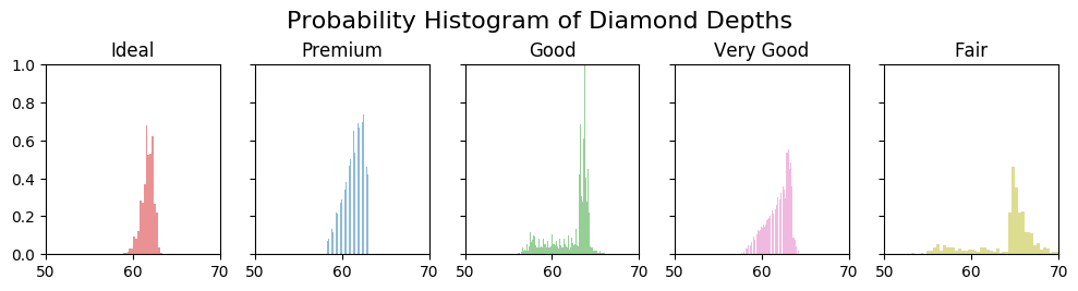Below I draw one histogram of diamond depth for each category of diamond cut. It’s convenient to do it in a for-loop.