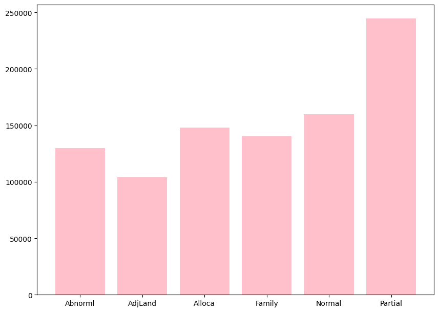 plt.bar(sales.index, height=sales.SalePrice, color='pink');