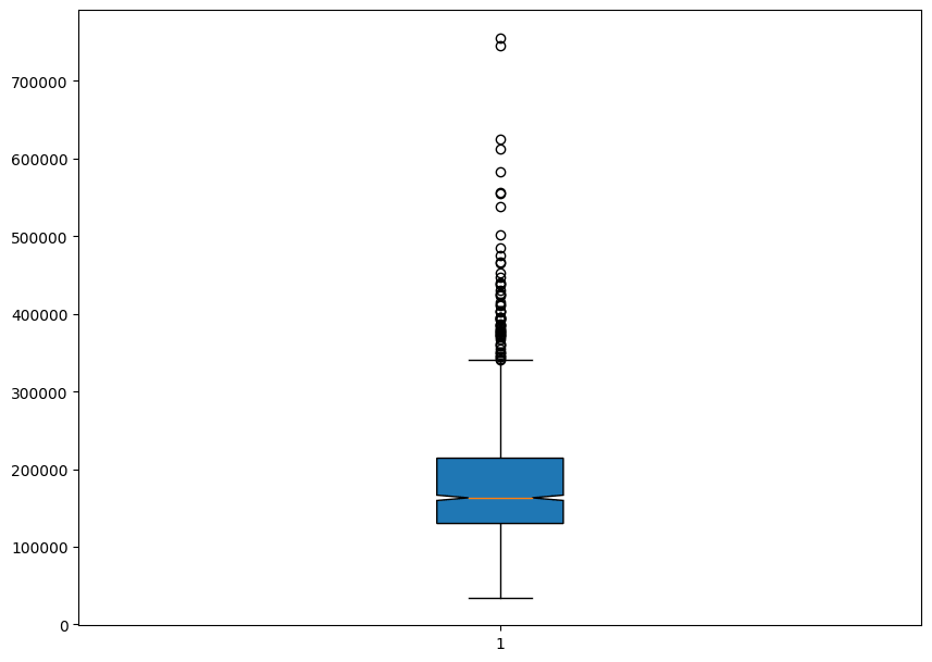 plt.boxplot(df['SalePrice'],patch_artist=True, notch=True);