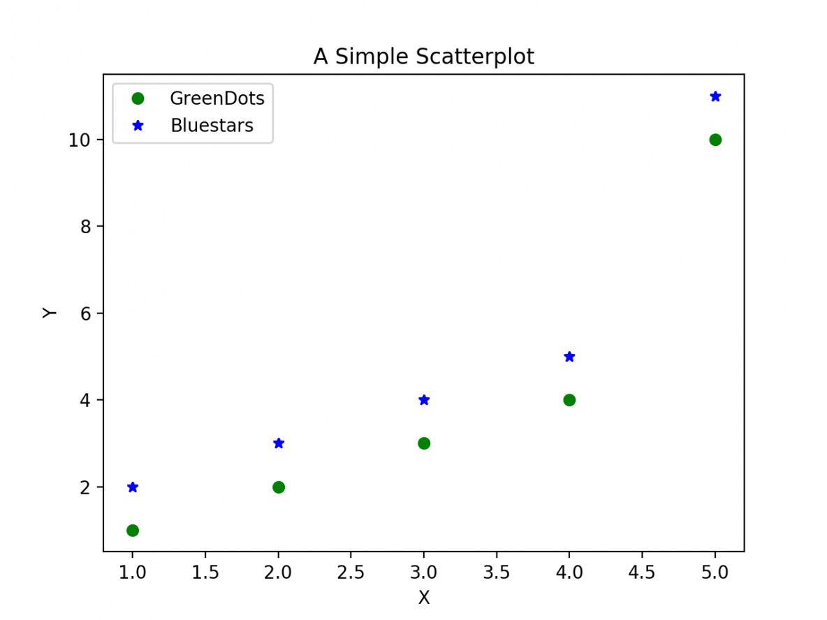 ax1.set_title('Scatterplot Greendots'); ax2.set_title('Scatterplot Bluestars')