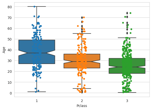 From the above boxplot with the distribution, we can see that the median age for a person in first class is around 38 and for a person in second class is 29 and for a person in third class is around 24.