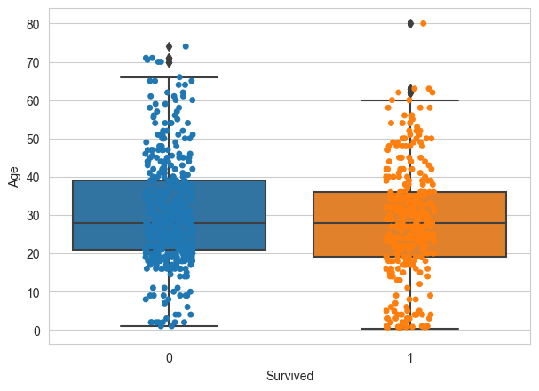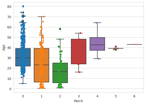 You can also see where the ‘cream of the data’ is situated by the location of the box. There are multiple outliers as well in ‘Age’ when split by Parch.