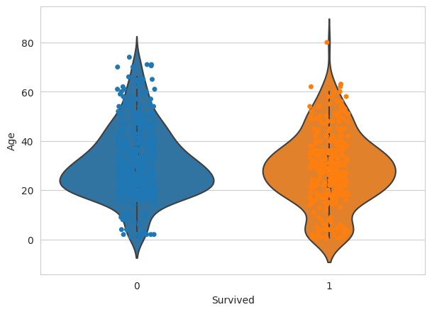 The above graph shows the distribution of Age vs whether the person has survived or not using violin plot.