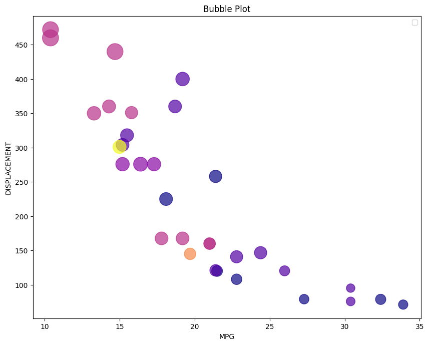 Normally you will use 2 varibales to plot a scatter graph(x and y), then I added another categorical variable df['carb'] which will be implied by the color of the points, I also added another variable df['wt'] whose value will be implied according to the intensity of each color.
