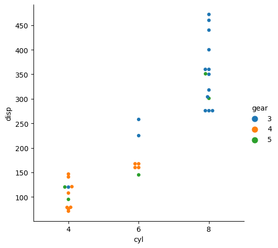 sns.catplot(x="cyl", y="disp", hue="gear", kind="swarm", data=df);