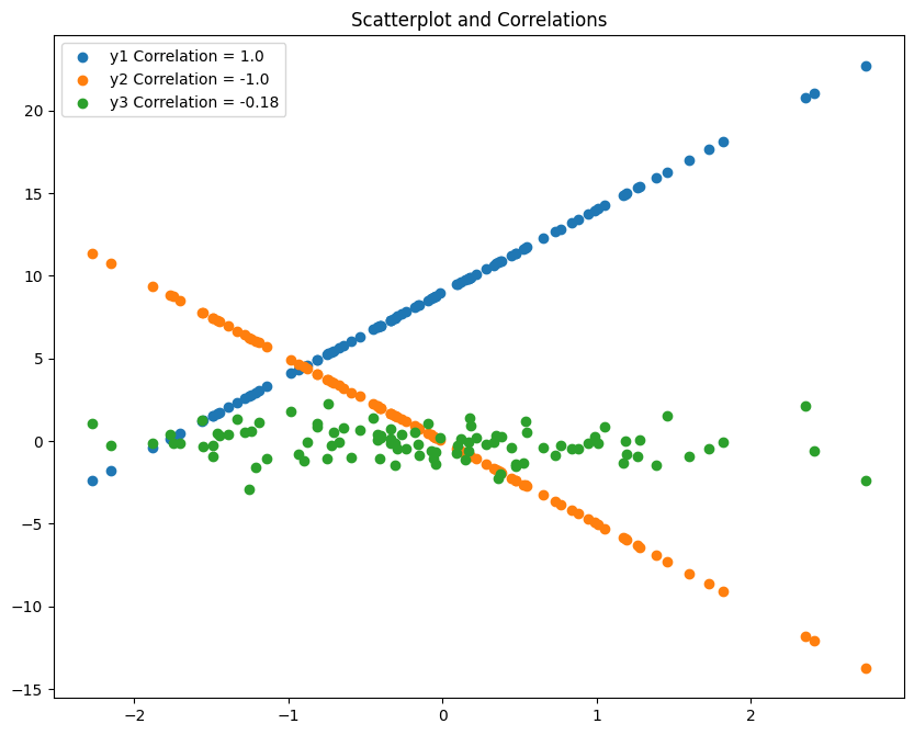 In the above graph, you can see that the blue line shows an positive correlation, the orange line shows a negative corealtion and the green dots show no relation with the x values(it changes randomly independently).