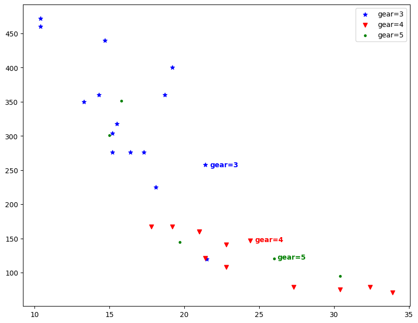 plt.text(24.5+0.2, 145, "gear=4", horizontalalignment='left', size='medium', color='red', weight='semibold')