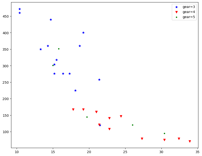 I splitted the dataset according to different categories of gear. Then I plotted them separately using the scatter() function.