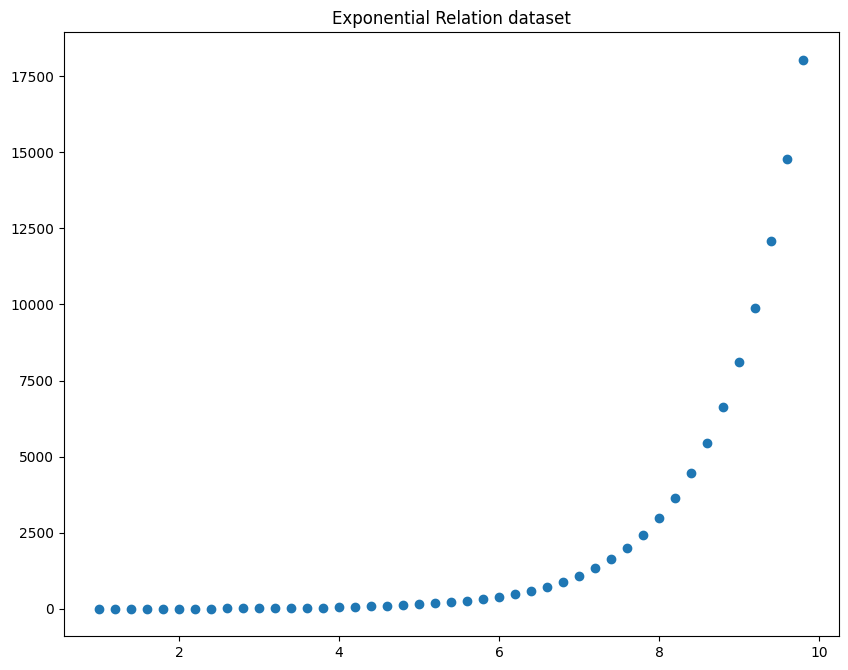 Lets create a dataset with exponentially increasing relation and visualize the plot.