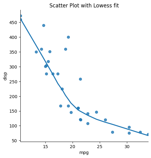 sns.lmplot(x='mpg', y='disp', data=df, lowess=True)
