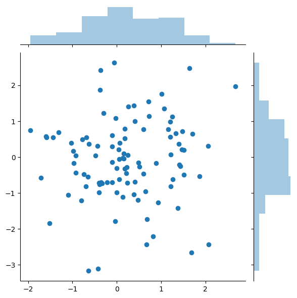 First let’s see a scatter plot to see a distribution between mpg and disp and their histogramic distribution. You can do this by using the jointplot() function in seaborn.