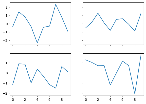 fig, ax = plt.subplots(2, 2, sharex='col', sharey='row')