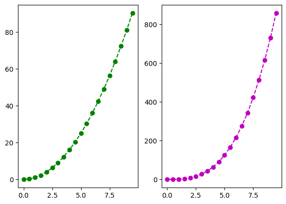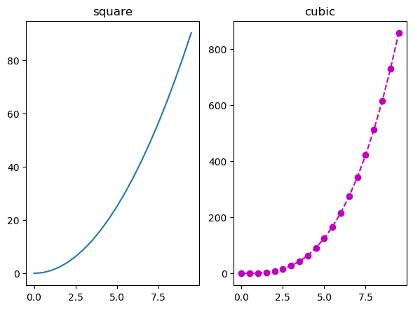 Let’s create an artificial dataset using the np.arange() function. Then, calculate the square and cubic values and plot them in the same graph side-by-side.
