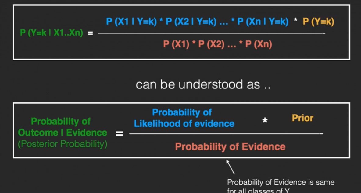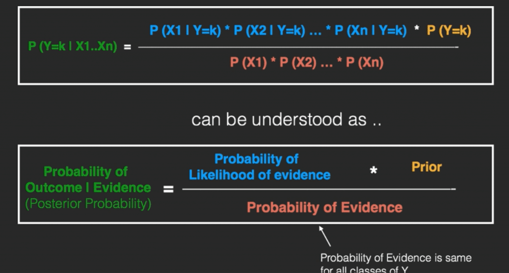 The RHS has 2 terms in the numerator. The first term is called the ‘Likelihood of Evidence’. It is nothing but the conditional probability of each X’s given Y is of particular class ‘c’. Since all the X’s are assumed to be independent of each other, you can just multiply the ‘likelihoods’ of all the X’s and called it the ‘Probability of likelihood of evidence’.