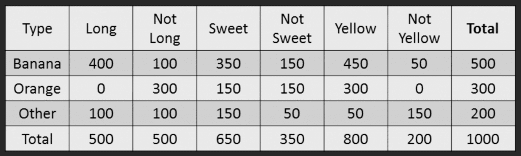 That means the probability the fruit is ‘Long’ given that it is a Banana. In the above table, you have 500 Bananas. Out of that 400 is long.
