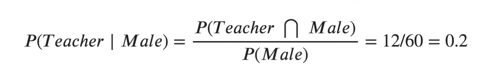 To calculate this, you may intuitively filter the sub-population of 60 males and focus on the 12 (male) teachers. So the required conditional probability P(Teacher | Male) = 12 / 60 = 0.2. This can be represented as the intersection of Teacher (A) and Male (B) divided by Male (B). Likewise, the conditional probability of B given A can be computed. The Bayes Rule that we use for Naive Bayes, can be derived from these two notations.