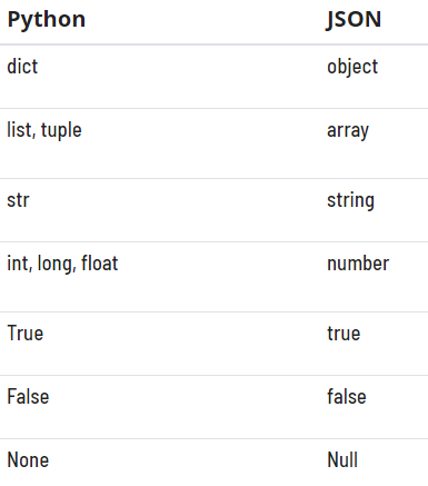 Python objects are converted to JSON by following this conversion.