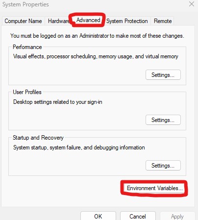 Alternately, instead of steps 3 and 4, you can search for “Environment Variables” in the Start menu and select “Edit the system environment variables”