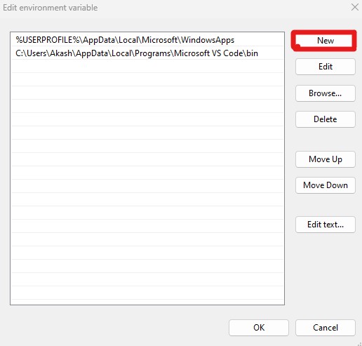 Step 7. In the “Edit environment variable” dialog, click on the “New” button, and paste the Python installation directory path that you copied in step 2. Repeat this step to add the \Scripts subdirectory path as well.