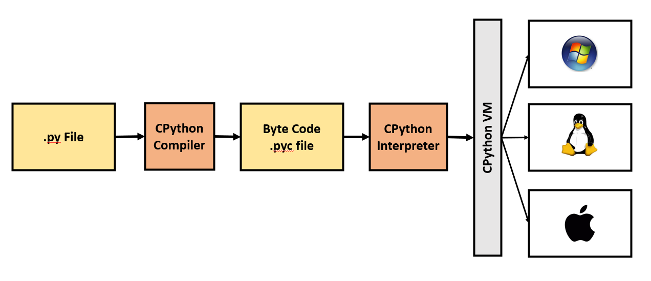 - CPython compiles the source code (.py file) to generate bytecode (.pyc file).