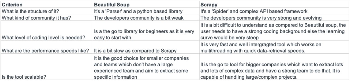 On the other hand, Beautiful Soup should be the preferred choice for small teams and companies whose data requirements are more or less constand and are not very time bound. Even with a beginners team, they will be able to do it complete it fairly quickly.