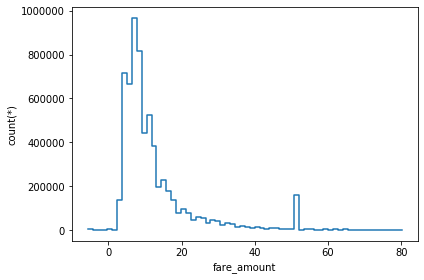 Consider the dataframe used previously. Let’s say we need to visualize the values taken by fare_amount. You can easily visualize through a 1D plot by making use of vaex’s plot1d() function. There is a parameter limits that will show a histogram showing 99.7% of the data as shown below.