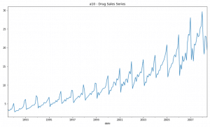 Alright, let’s run the ADF test on the a10 dataset from the fpp package from R. This dataset counts the total monthly scripts for pharmaceutical products falling under ATC code A10. The original source of this dataset is the Australian Health Insurance Commission.