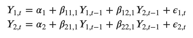 For example, the system of equations for a VAR(1) model with two time series (variables `Y1` and `Y2`) is as follows: