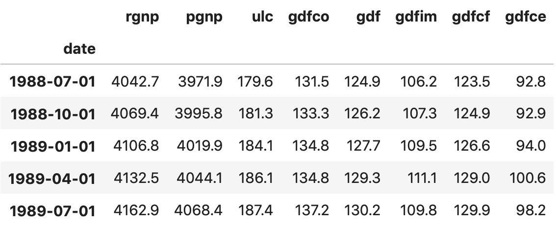 1. rgnp : Real GNP. 2. pgnp : Potential real GNP. 3. ulc : Unit labor cost. 4. gdfco : Fixed weight deflator for personal consumption expenditure excluding food and energy. 5. gdf : Fixed weight GNP deflator. 6. gdfim : Fixed weight import deflator. 7. gdfcf : Fixed weight deflator for food in personal consumption expenditure. 8. gdfce : Fixed weight deflator for energy in personal consumption expenditure.