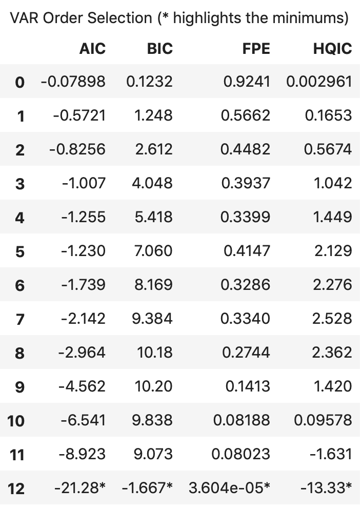 In this article we covered VAR from scratch beginning from the intuition behind it, interpreting the formula, causality tests, finding the optimal order of the VAR model, preparing the data for forecasting, build the model, checking for serial autocorrelation, inverting the transform to get the actual forecasts, plotting the results and computing the accuracy metrics.